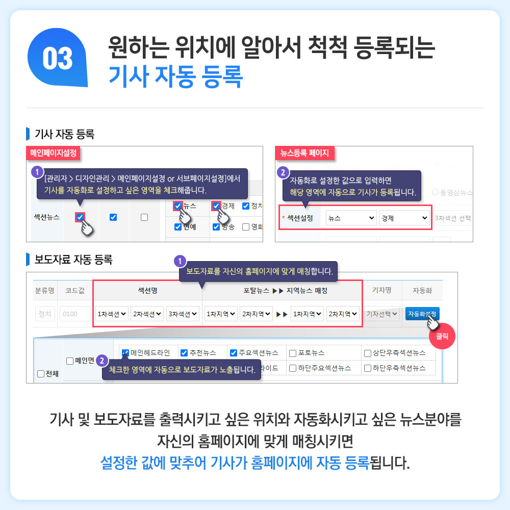 기사 자동 등록 시스템 / PC, 모바일 출력 설정 / 숏츠 페이지 / 다양해진 후원서비스 / 서브페이지 디자인 설정 등